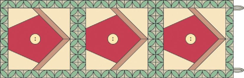 Make 3 blocks, and add block leaf border (see Borders page) around each block. Stitch blocks in a row. Add loops for hanging. Finished size is about 39 X 13 inches.