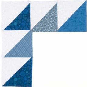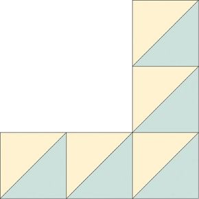 Stitch triangle to contrasting triangle. Sew blocks together to needed lengths, matching unlike fabrics. For center of each side, stitch a block of matching fabrics to create larger triangle.