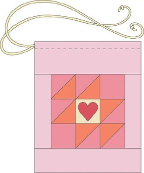 Sew A to contrast A; make 6. Stitch AA to AA, matching unlike fabrics, then stitch on B. Make 2. Stitch AA to B, with contrast triangle at bottom, then stitch on AA, with contrast triangle at top. Stitch rows together, with the bottom row sewn on starting with B square. Fuse heart to center square. By hand or machine, appliqué heart using narrow blanket stitch.