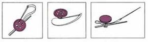 Most buttons can be sewn with general-purpose thread. Buttons should be sewn on loosely to allow for the overlapping garment layer containing the buttonholes. Buttons sewn too tightly will make the button difficult to close. Sew-through buttons usually have two or four holes through which the button is sewn to the garment. Shank buttons have a loop on the back through which they are sewn to the garment.
